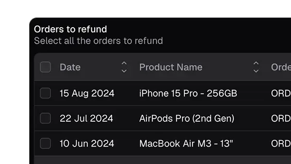 const orders = await io.tableInput({label: 'Orders to refund',description: 'Select all the payments to be refunded',})