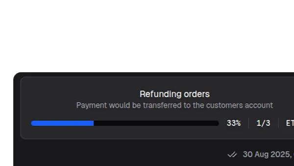 const progress = await io.progress({title: 'Refunding Orders', itemsInQueue: orders.length})for (const order of orders) {await refundOrder(order)await progress.incrementOne()}